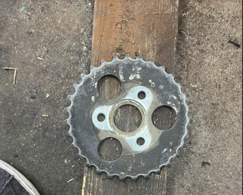 こちらが取り外した時のスプロケットの状態。チェーンオイルや砂、埃などがついて黒くなっています。